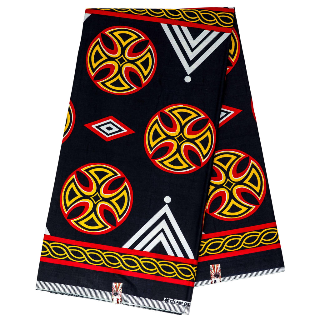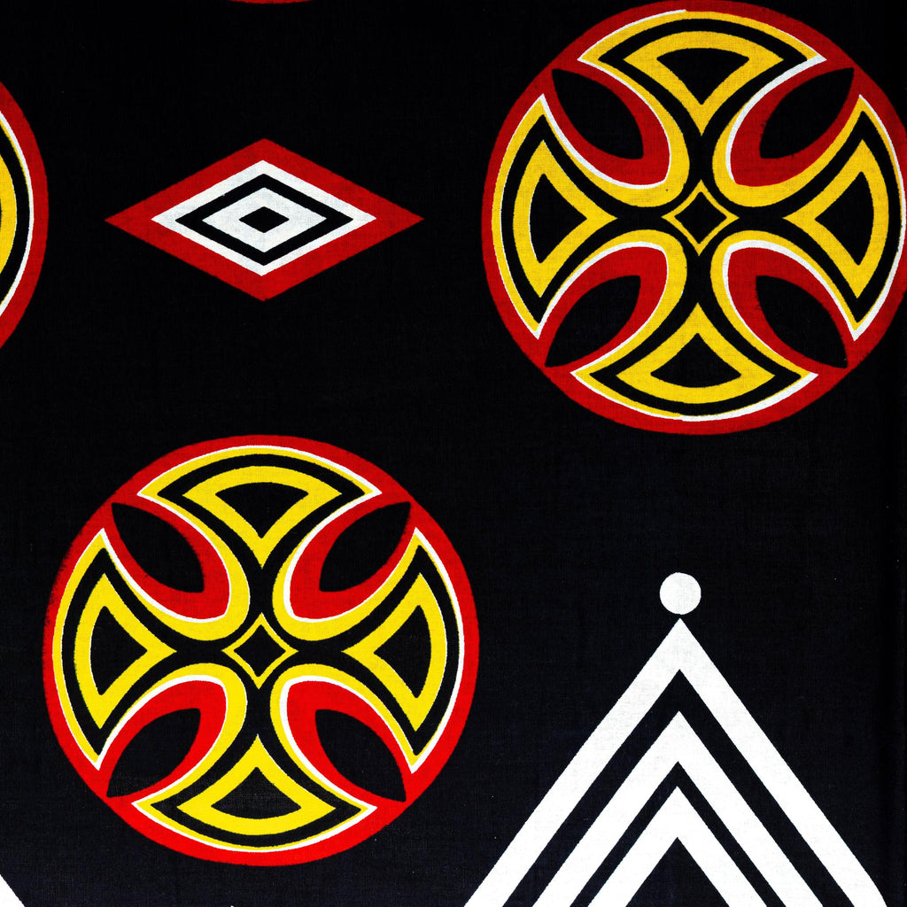 This 6-yard Toghu Bamenda wax print fabric features a striking design. Bold black is highlighted by vibrant red, yellow, and white accents in geometric patterns and iconic motifs. A perfect choice for creating unique garments and crafts.