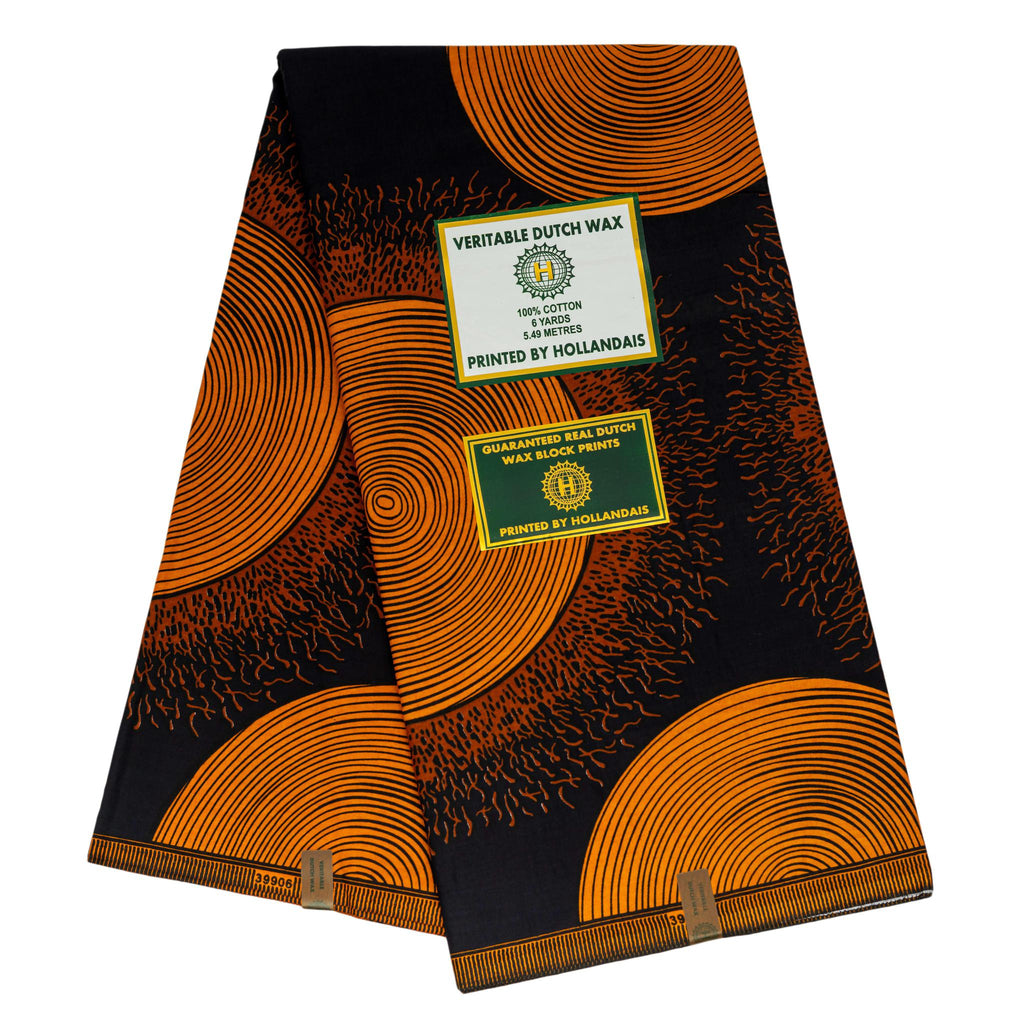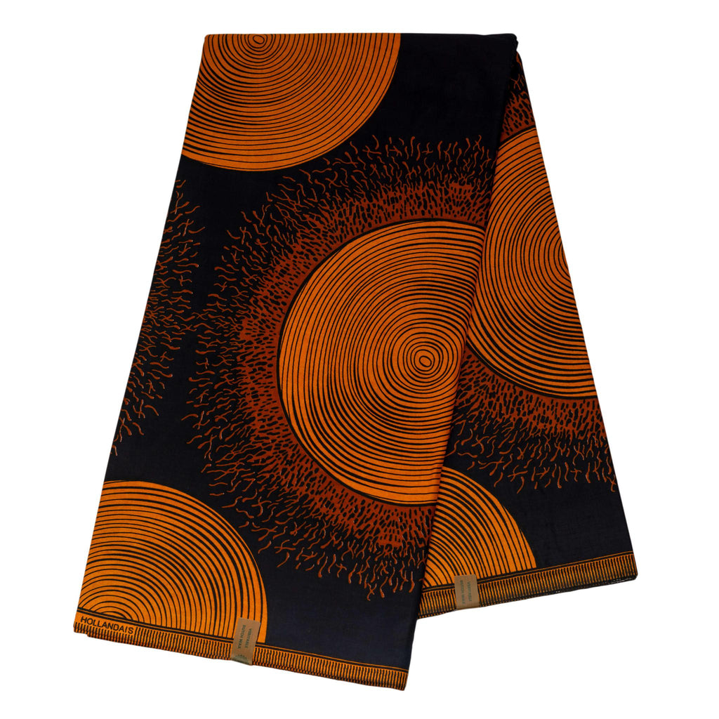 This is a 6-yard Ankara fabric with a bold geometric design. The cloth features striking orange circles and intricate patterns on a sleek black background, perfect for creating eye-catching apparel and accessories.