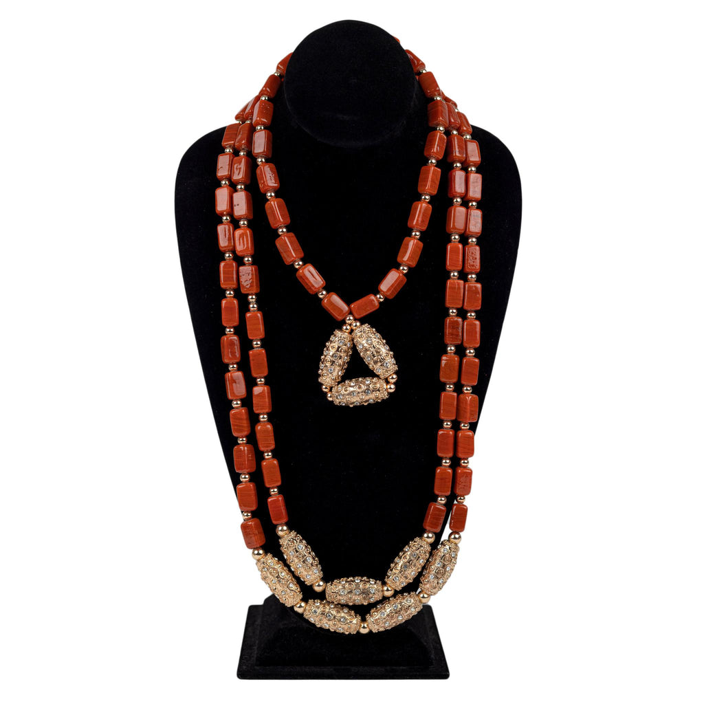 Embrace your inner royalty with this breathtaking coral and gold jewelry set. Crafted for the woman who is bold, confident, and unapologetically glamorous, this ensemble makes a powerful statement of style and prestige. The rich, earthy terracotta beads are beautifully contrasted with lavishly encrusted gold crystal elements, creating a look of unparalleled opulence.