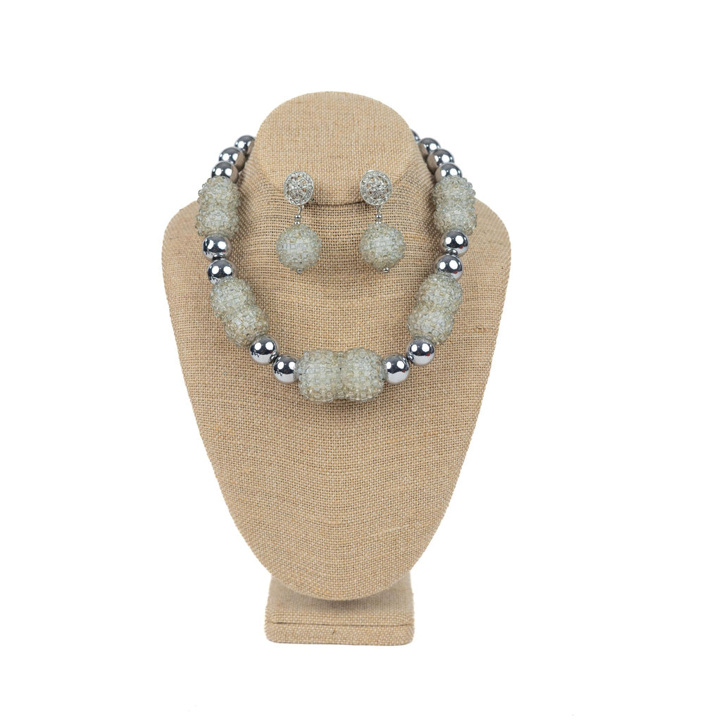 Make a breathtaking statement with this exquisite jewelry set, designed for the modern woman who appreciates elegance and bold style. The stunning combination of frosted, crystalline beads and sleek, polished silver creates a look of pure sophistication, guaranteed to turn heads at any event.