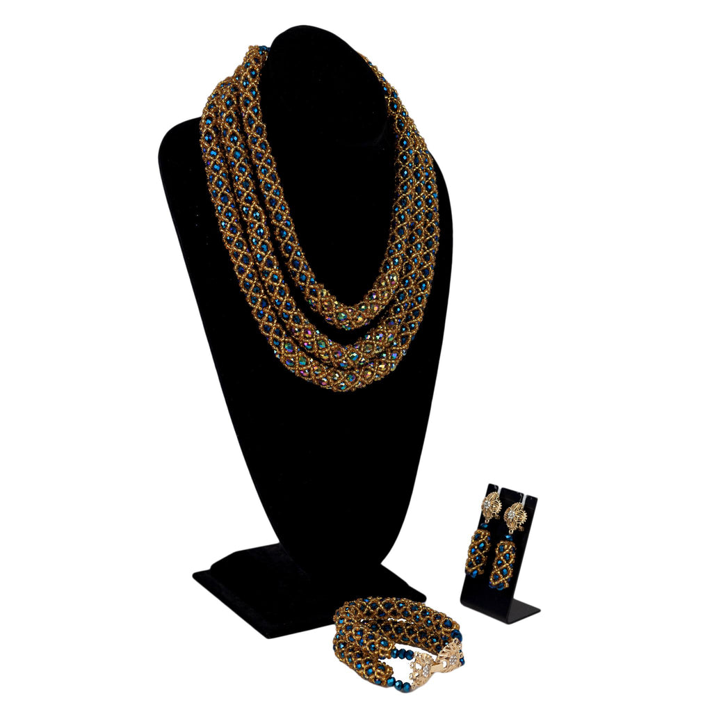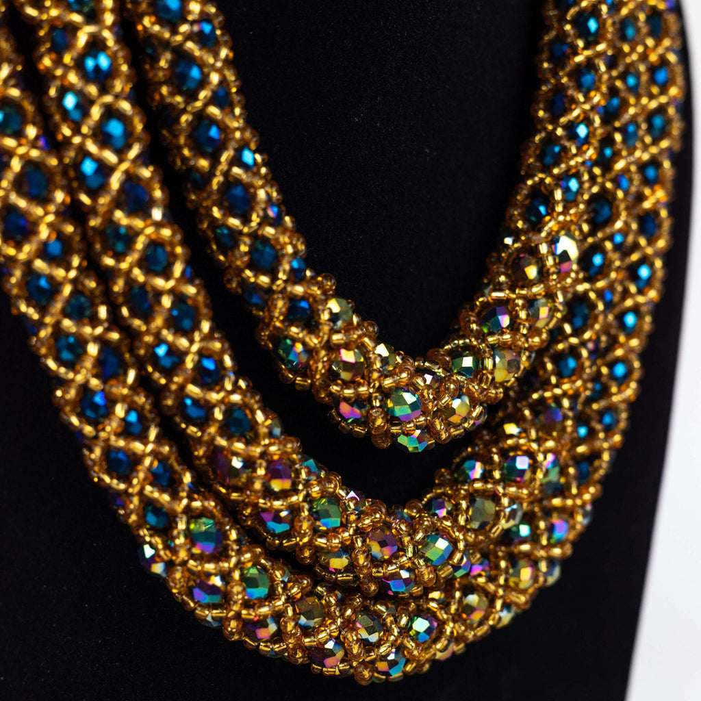 Unleash your inner goddess with this absolutely mesmerizing woven jewelry set. Inspired by the majestic beauty of a peacock's feather, this ensemble combines a rich tapestry of gilded gold seed beads with deep teal and iridescent, color-shifting crystals. The multi-tiered necklace drapes beautifully, creating a stunning bib of intricate latticework that sparkles with every movement.