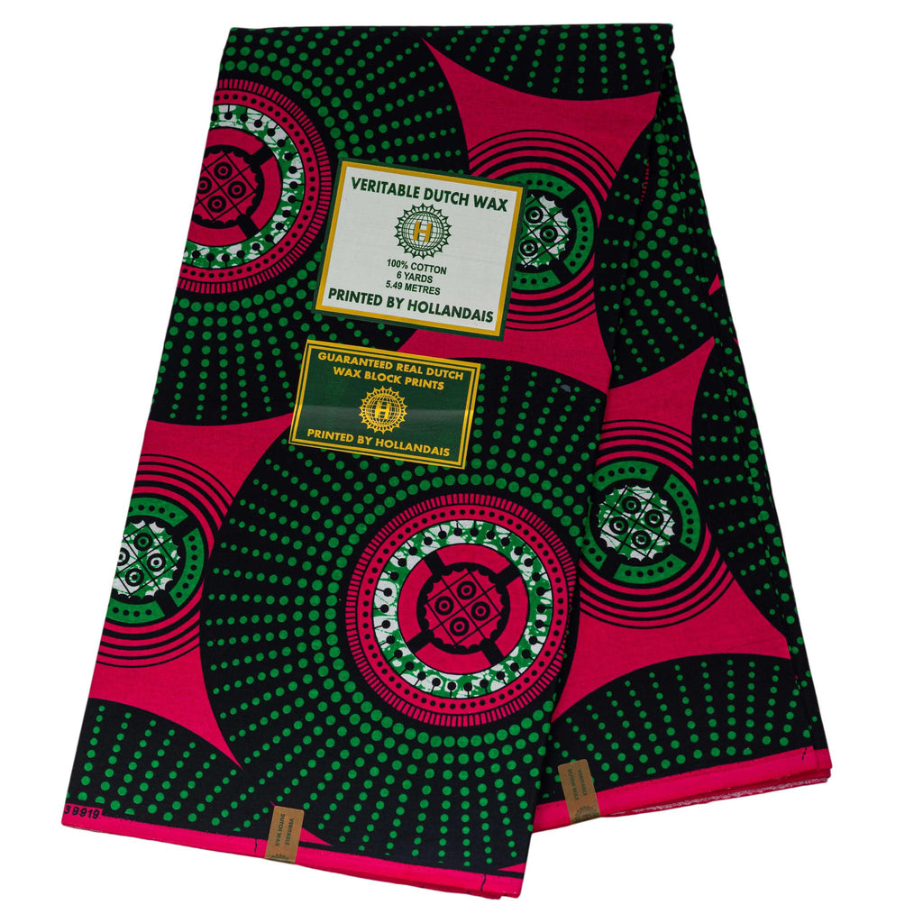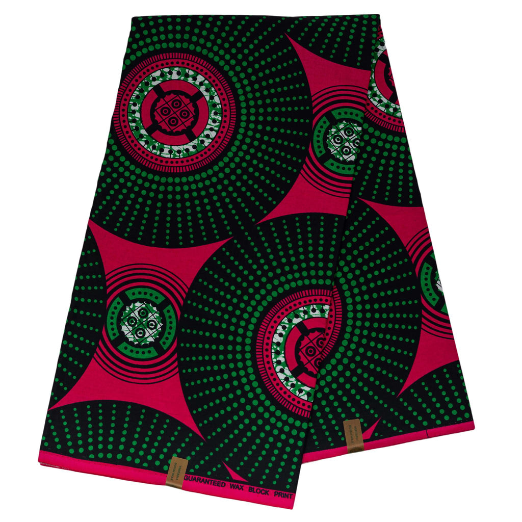 This vibrant 6-yard Ankara fabric features a bold geometric design. The pattern incorporates pink and green circles and accents, set against a striking black background. White details add a crisp contrast to this eye-catching piece.