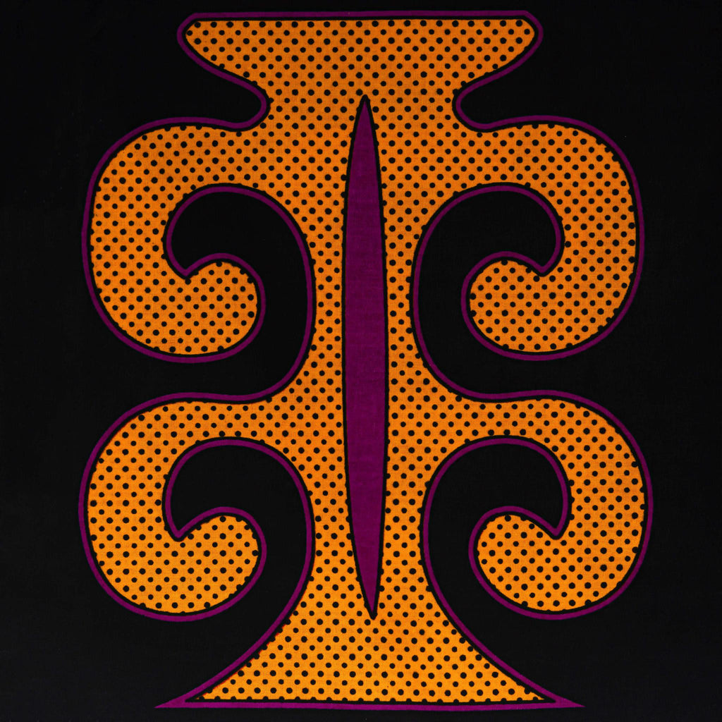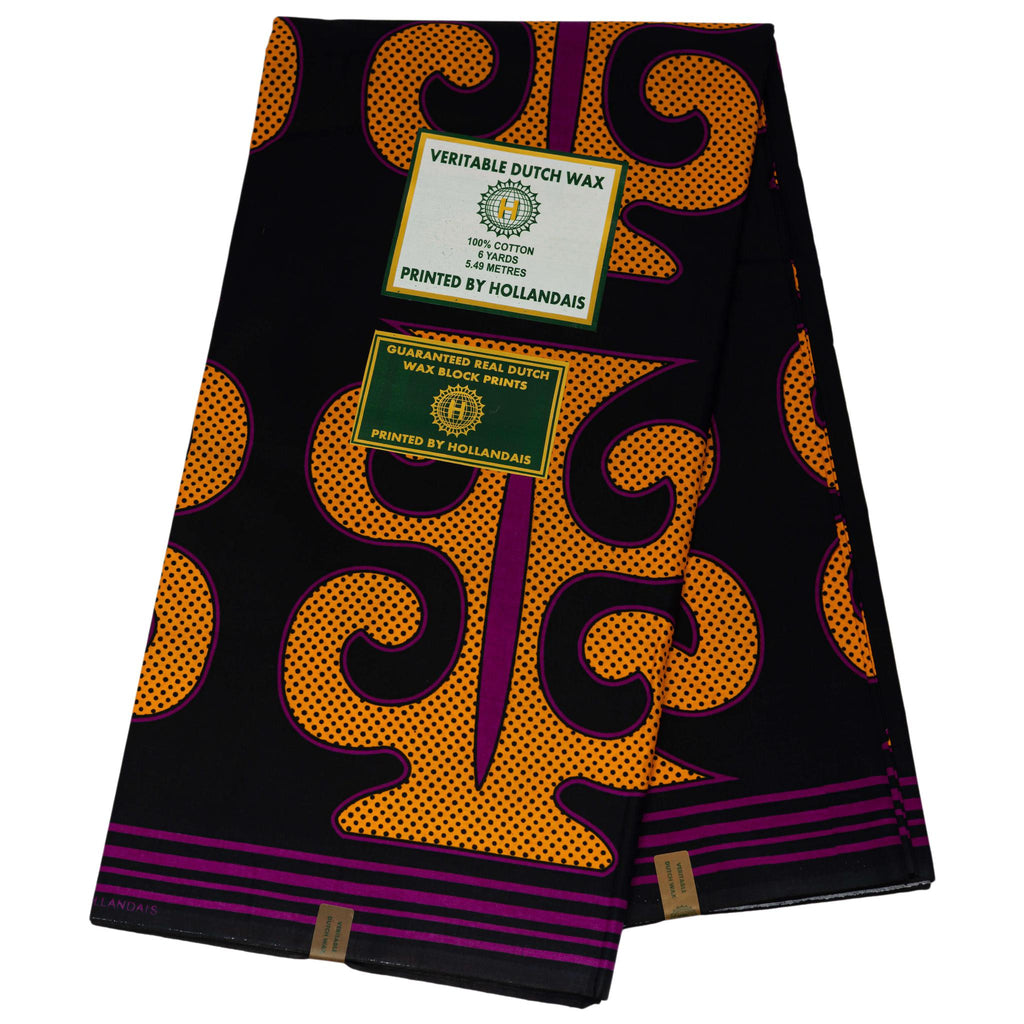 This 6-yard wax fabric features the striking Dwennimmen Symbol in bold orange with black dots, outlined in regal purple, against a solid black background. A truly vibrant and eye-catching design!
