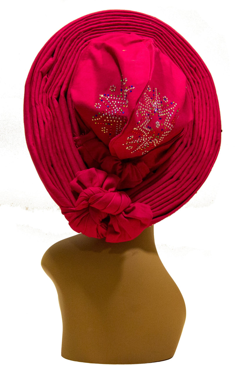 Gele is a traditional Nigerian Headwrap. It is worn during special occasions as an accessory to the traditional ‘iro’ (a wrap-around skirt) and ‘buba’ (a loose fitting blouse). Gele is usually made out of heavy or stiff fabric such as Aso Oke, and it can be wrapped and moulded into a specific shape. Aso Oke is originally a ceremonial fabric woven locally in Nigeria and is made up commonly of strands of cotton and/or silk. Aso Oke is also used to make Iro and Buba, but generally for very special occasions such as the brides wedding dress.