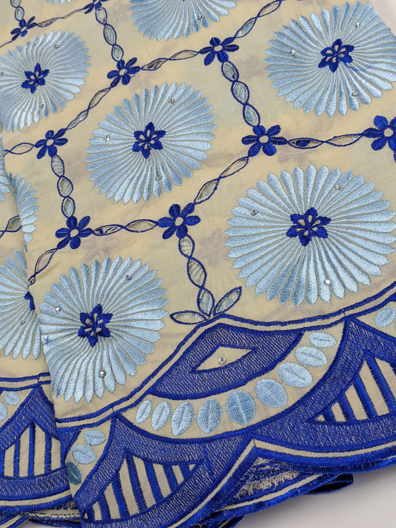 Blue & creme cotton lace with woven embroidery with crystals in 5 yards.