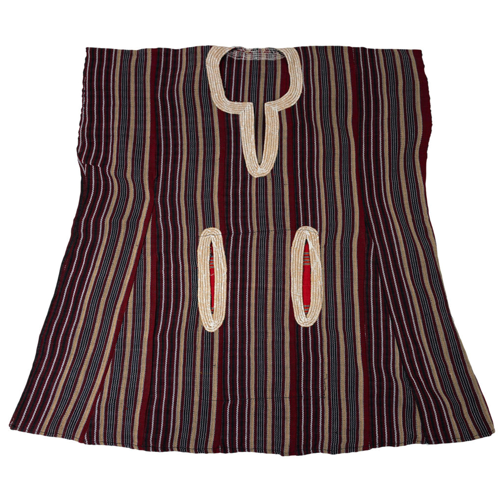 • Woven Smock Top: A classic sleeveless A-line tunic featuring a rich pattern of vertical stripes in burgundy, black, gold, and fine white accents. The chest is highlighted by prominent beige embroidery outlining the U-shaped neckline and the two traditional vertical pocket openings.