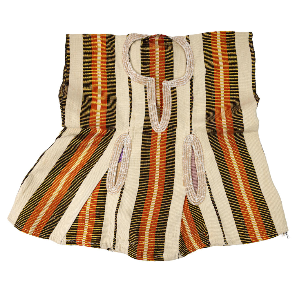 • Woven Smock Top: A distinctive sleeveless tunic featuring a lively vertical stripe pattern in burnt orange, black, and metallic gold against a cream background. The front is detailed with raised beige embroidery that frames the neckline and the two traditional pocket openings.
