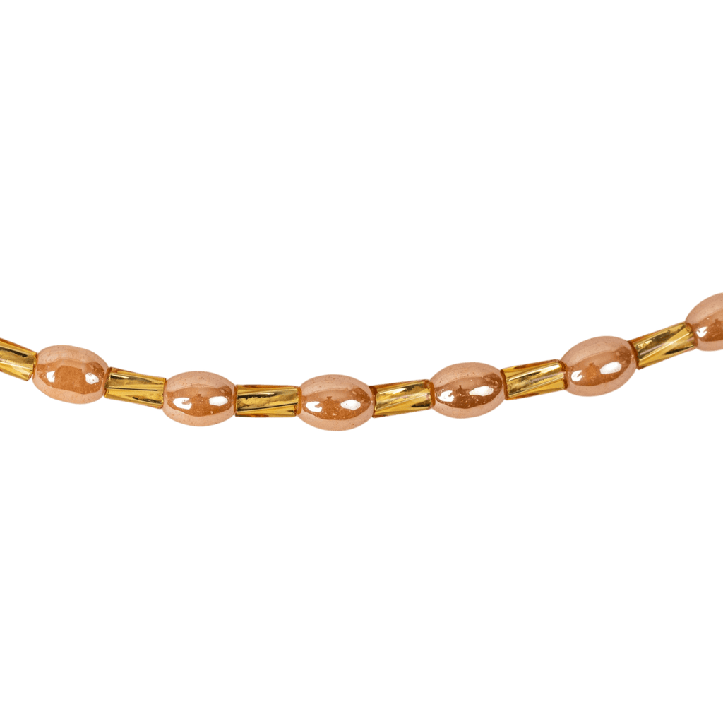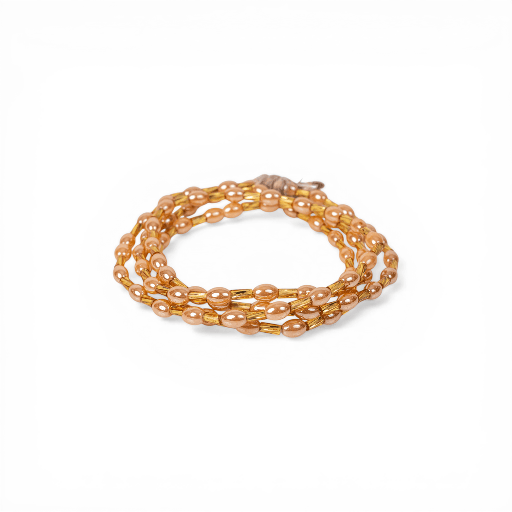 Adorn yourself in warm, glowing elegance. Embrace your divine feminine energy with our Champagne Radiance Waist Beads. These beautifully crafted beads feature a sophisticated, warm metallic palette—reminiscent of golden hour or a glass of sparkling champagne. The unique design showcases an elegant alternating pattern of smooth, lustrous oval beads in a soft rose-gold hue, perfectly spaced with gleaming, cylindrical gold tube beads that catch the light beautifully with your every movement.