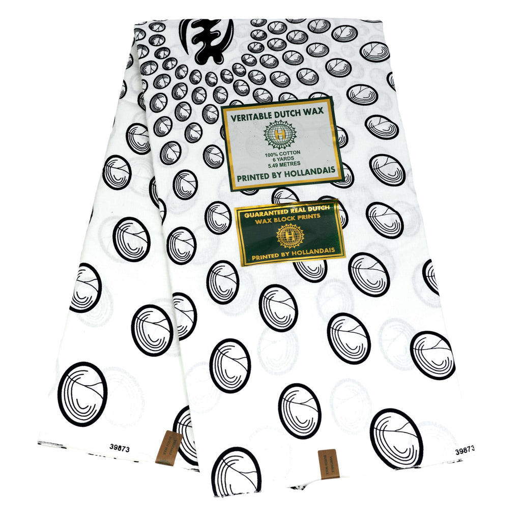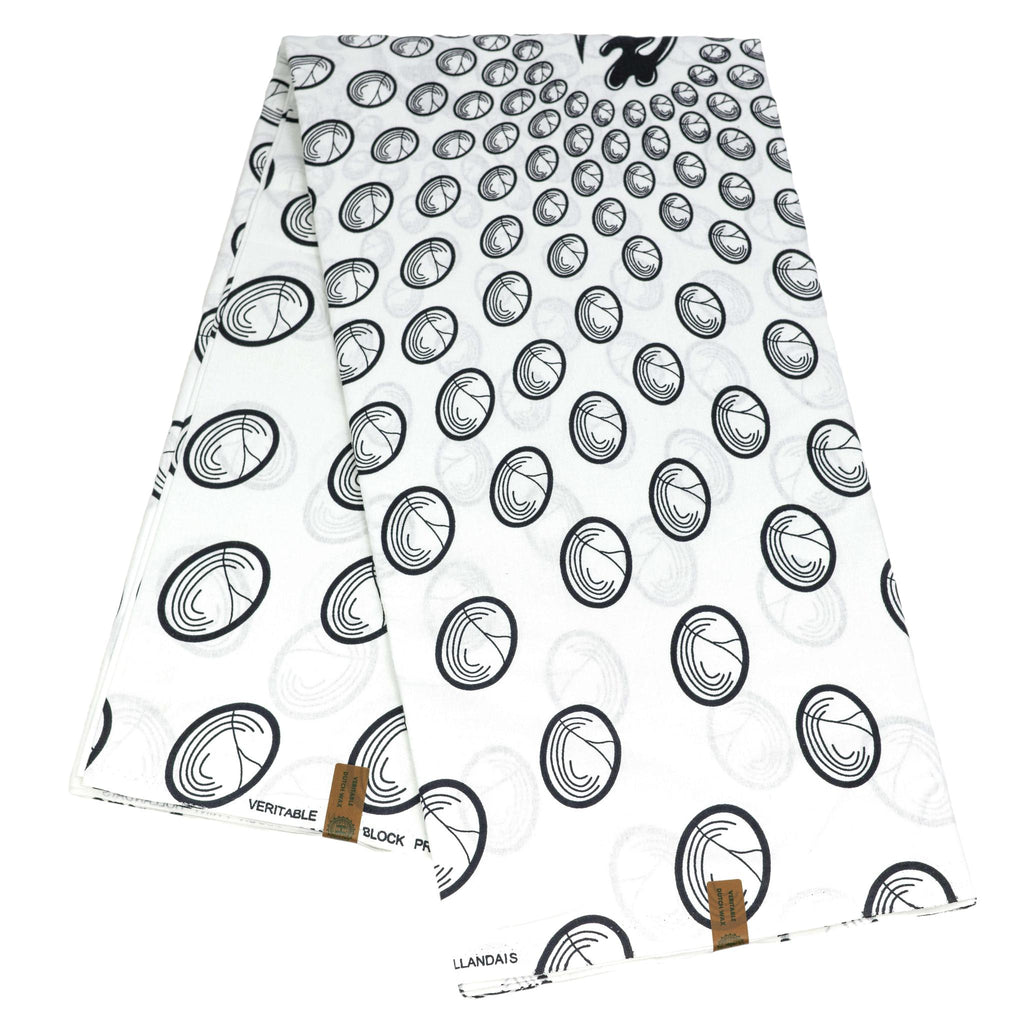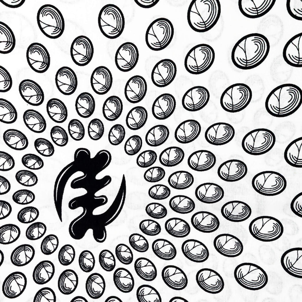 This 6-yard Gye Nyame fabric features a striking black and white design. The background is white, with bold black Gye Nyame symbols and a repeated circular pattern. A classic and culturally rich textile for various creative projects.