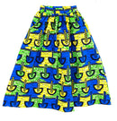 - Striking Symbolic Print: The skirt features a captivating design with a repeating symbolic motif in bold black. The intricate patterns are brought to life by a vivid color scheme of sunny yellow, rich blue, and lush green, creating a visually dynamic and meaningful piece.