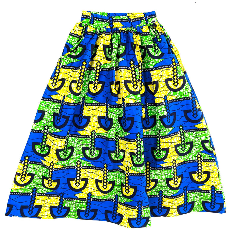 Women's handmade ankara wax midi skirt in blue, green and yellow print with pockets. This beautiful midi skirt is not only super comfortable and a must have for any woman who wants to dazzle, it is intricately designed and is the perfect attire for church, meetups and dates.