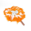 This beautiful detailed traditional feathered hand fan is usually used at wedding engagement cermonies as a bridal accessory. It is handmade from genuine materials, and is a must-have for special and distinctive brides. This glam round feathered hand made fan also comes with a trimming clutch sequenced handle and beaded triming centered design and is made to suits all African events. The fan comes in different colours, and it doesn’t fold.