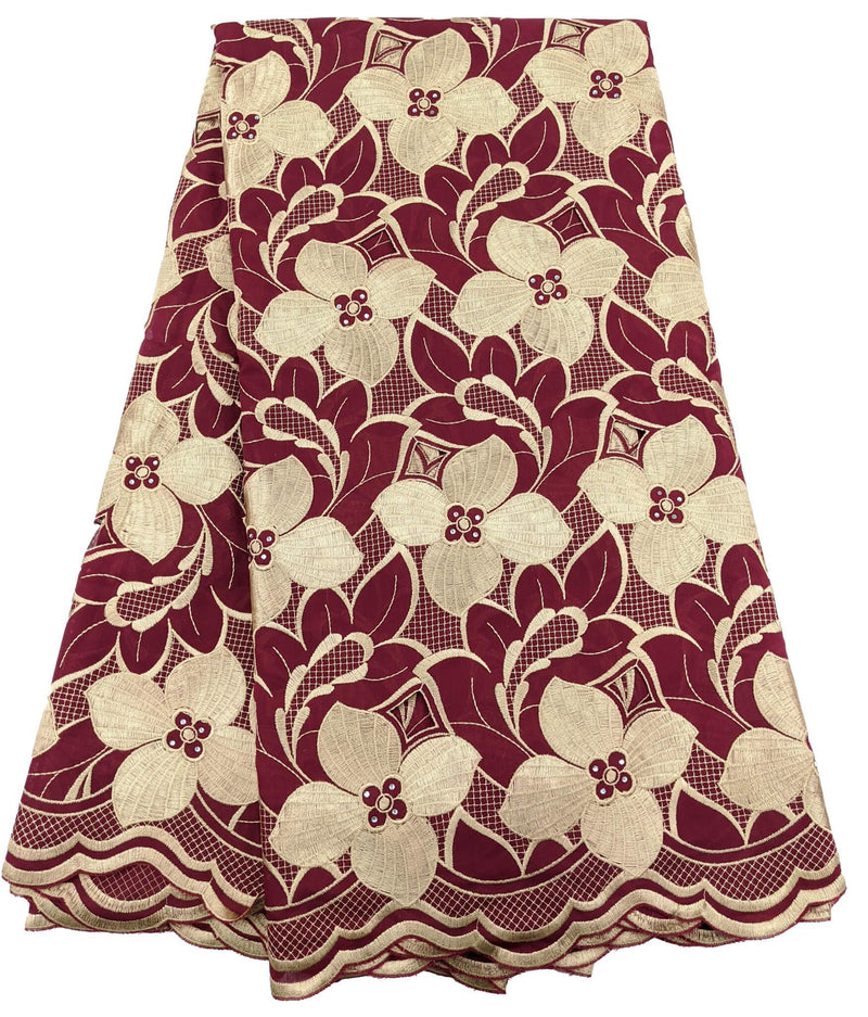 Wine and gold cotton lace with crystals, and flowery embroidery in 5 yards