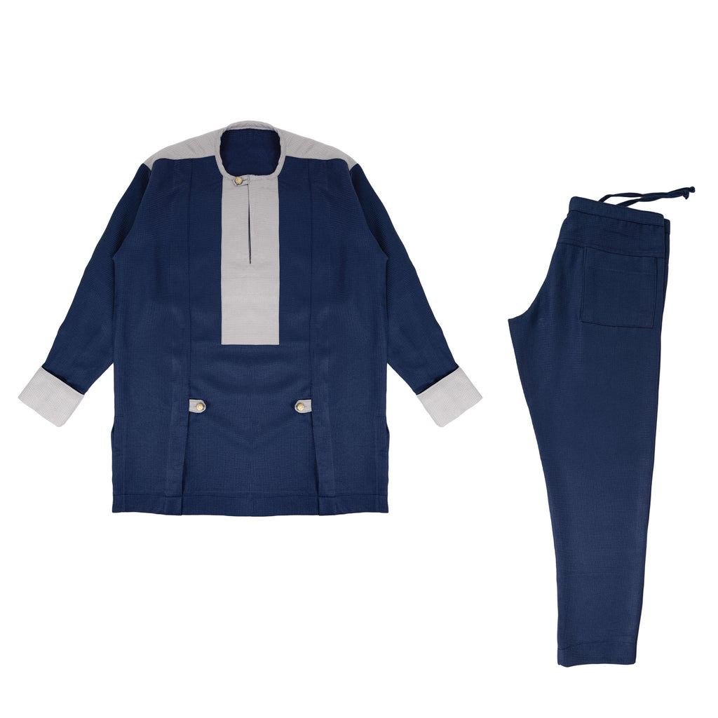 Comfortable & Stylish Trousers: The set is completed with matching trousers in the same navy blue textured fabric. Designed for a perfect fit, they feature a comfortable and adjustable drawstring waist, blending a relaxed feel with a sharp, tailored look.