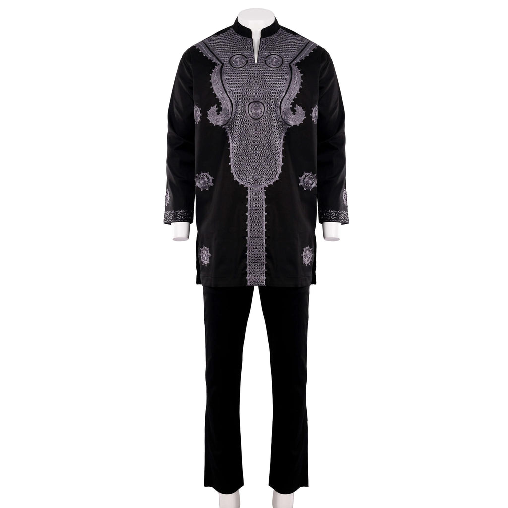 Step into refined sophistication with this impeccably tailored men’s two-piece outfit. Crafted in a deep, classic black, this ensemble features intricate grey embroidery that blends traditional African design elements with a sleek, modern silhouette — perfect for the man who values cultural heritage and contemporary style.