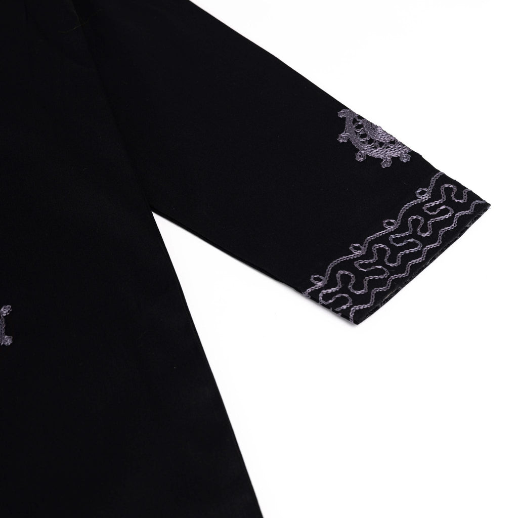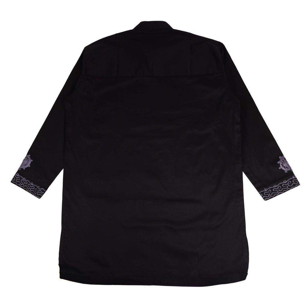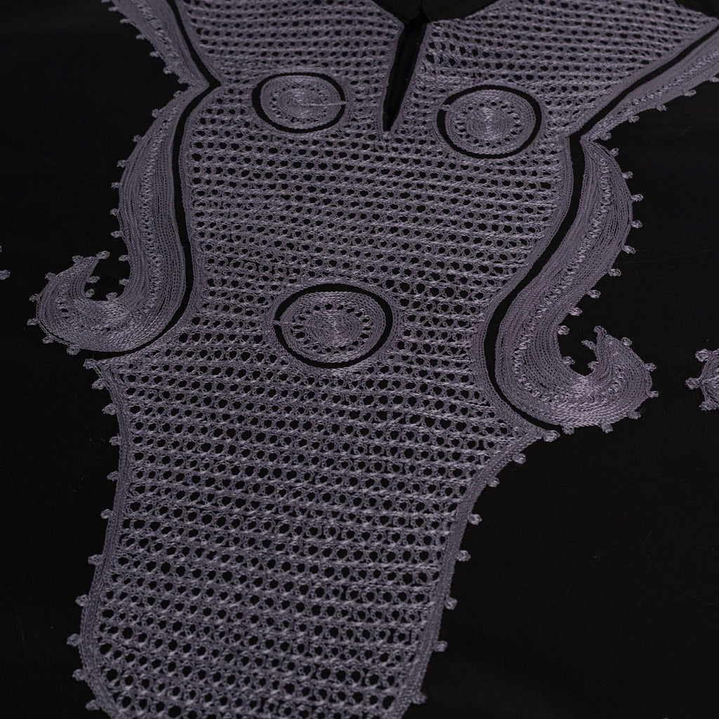 The long-sleeved tunic is adorned with symmetrical grey embroidery across the chest, sleeves, and lower front. The geometric patterns add depth and artistry, creating a distinguished and culturally rich look. -
